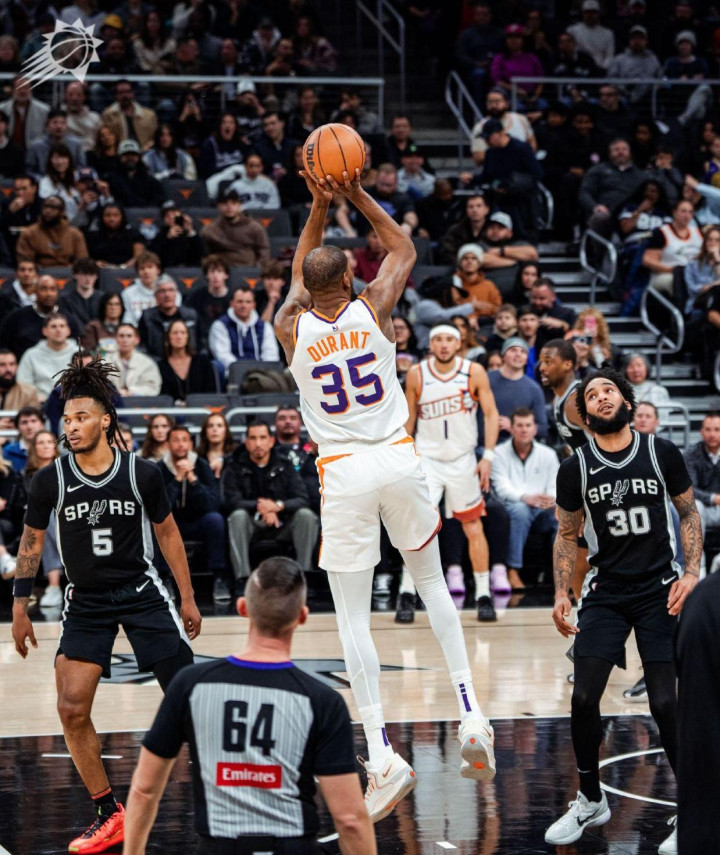 比赛最后一节,杜兰特的三分球让太阳队几度迫近分差。