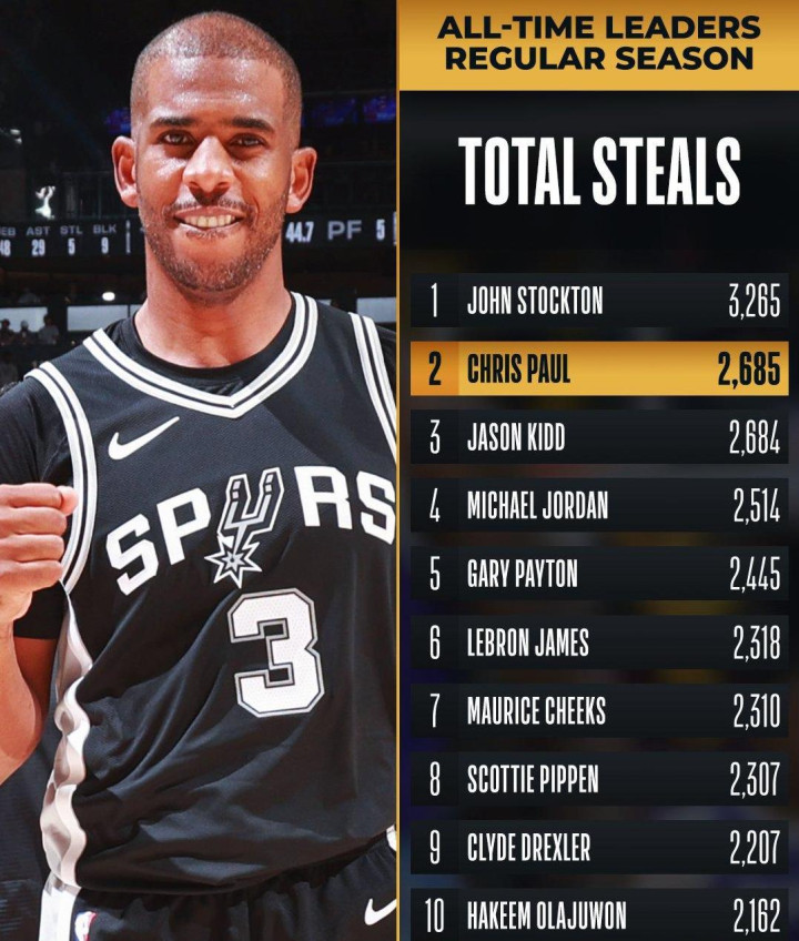 此外,保罗在防守端铲断对手,甚至超过了NBA名宿贾森·基德,成为历史上抢断次数第二多的人。